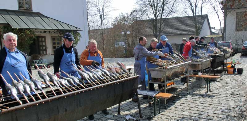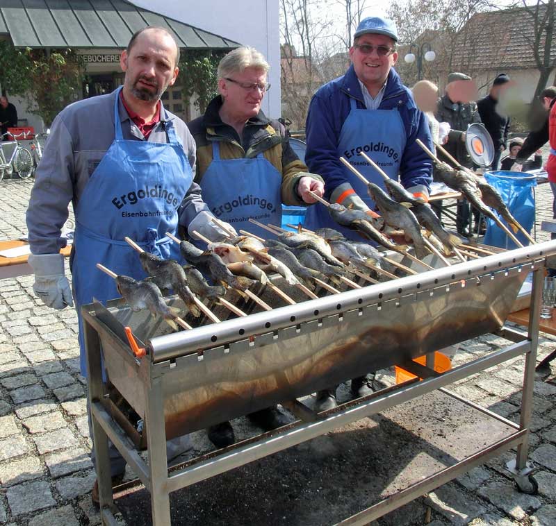 Von Andreas Strauß | 30. März 2013 | Kategorie: Allgemein | Kommentare deaktiviert für KarfreitagsspeiseDie Ergoldinger Eisenbahnfreunde haben ihre Tradition fortgesetzt und für alle Steckerfischbegeisterten frisch zubereitete Fische gegrillt. Am gestrigen Karfreitag duftete es im ganzen Rathausinnenhof nach frisch gegrilltem Fisch. Das ist zu diesem Zeitpunkt noch etwas ganz besonderes; ist es doch zumeist die erste Grillspeise in der Saison. Aber auch die Temperaturen sind ungewöhnlich. Trotzdem hatten die Griller viel Glück mit dem Wetter. War es noch vor 2 Tage überall schneeweiß und s..kalt, war es am Karfreitag teilweise sonnig und man konnte es schön am warmen Grill gut aushalten.