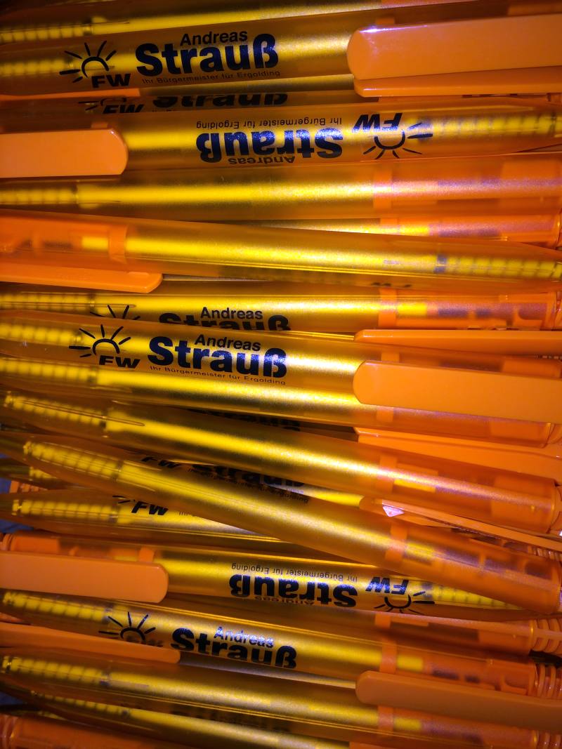 schöne orange Kugelschreiber mit dem Aufdruck „Andreas Strauß – Ihr Bürgermeister für Ergolding“.
