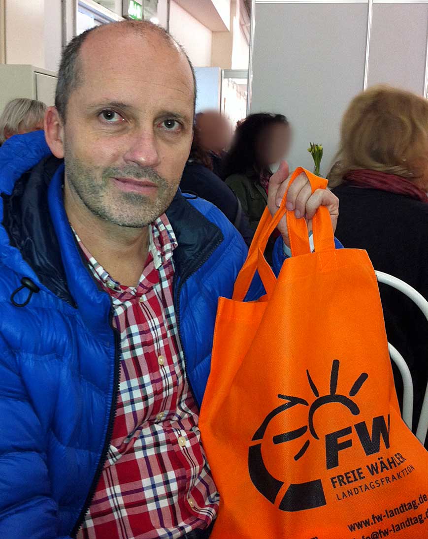 Was hat das alles mit der Farbe Orange zu tun. Auf der Messe waren auch politische Gruppierungen vertreten. Die Freie Wähler Landtagsfraktion hat auch einen Stand. Und die Besucher bekamen alle schöne grell-orange Taschen mit Informationen. Am Nachmittag hab ich mich dann ein bisserl hingesessen und es war recht schön anzusehen, wie hunderte Menschen die Messe mit orangen Taschen farbenfroh gestalteten.