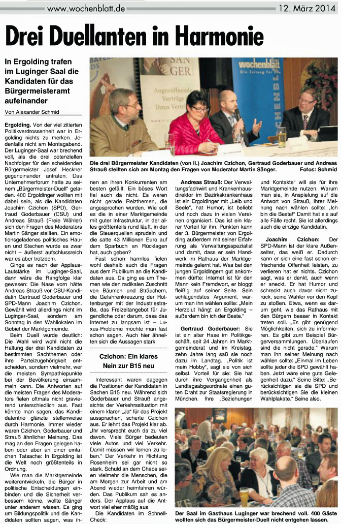 Von Andreas Strauß | 12. März 2014 | Kategorie: Allgemein | Kommentare deaktiviert für Bürgermeister Duell in ErgoldingNun fand das heiß ersehnte Bürgermeisterduell in Ergolding statt. Das Duell lief doch sehr friedlich und im guten Rahmen ab. Das hat mich dann auch sehr gefreut.