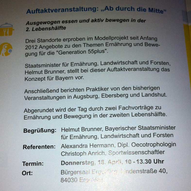 Ja das war der Titel der Auftaktveranstaltung des Modellprojekts „Netzwerk Generation 55 plus Ernährung und Bewegung“ gestern im Ergoldinger Bürgersaal. Der Bürgersaal war gut gefüllt. Helmut Brunner, Bayer. Staatsminister für Ernährung, Landwirtschaft und Forsten, eröffnete die Veranstaltung. Er trug sich im Beisein von 1. Bürgermeister Heckner und 3. Bürgermeister Strauß ins goldene Buch des Marktes Ergolding ein.