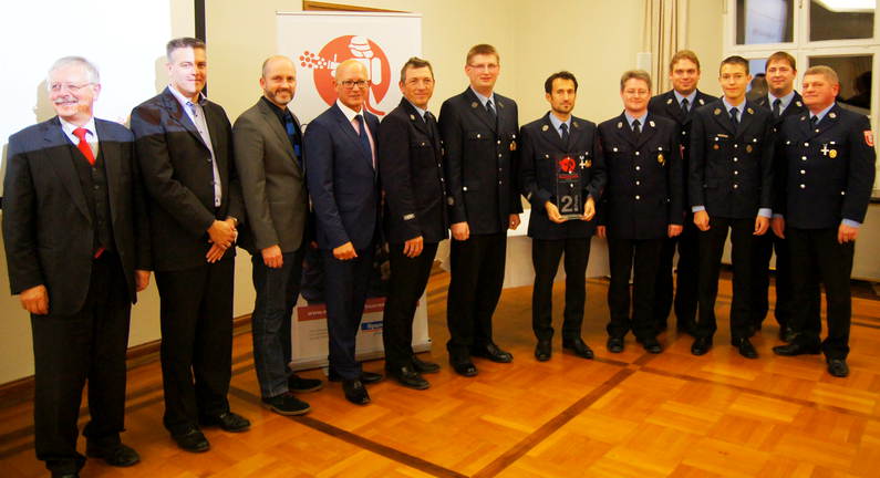 Strahlende Gesichter bei Preisträgern und Jury (v.l.): Joachim Neumann (FF Adlkofen/3. Preis), Stefan Prechtl (Sparda-Bank Ostbayern eG/Jurymitglied), Heinz Grunwald (Regie-rungspräsident von Niederbayern/Schirmherr und Jurymitglied), Johann Weber (Vorsit-zender des Bezirksfeuerwehrverbandes Oberpfalz/Jurymitglied), Georg Thurner (Vor-standsvorsitzender der Sparda-Bank Ostbayern eG/Jurymitglied), Julia Simon (Hoch-schulgruppe der FF Passau/1. Preis), Dieter Schlegl (Vorsitzender des Bezirksfeuerwehr-verbandes Niederbayern/Jurymitglied), Stefan Windele (FF Piflas/2. Preis)