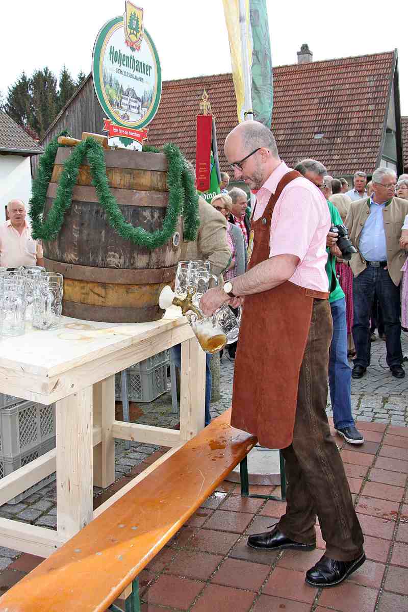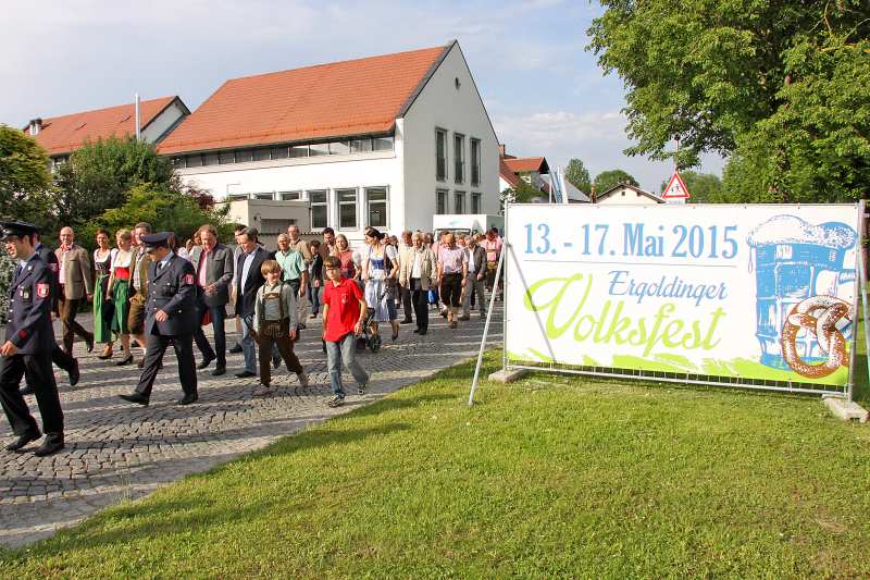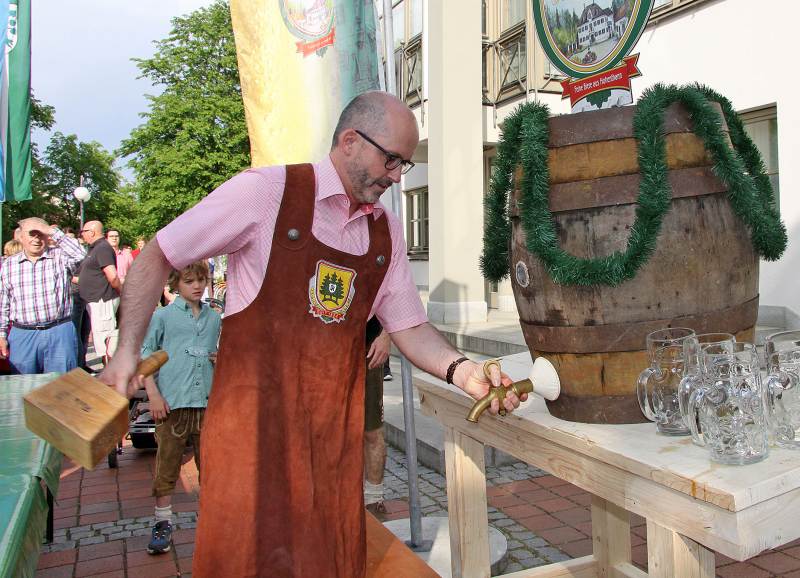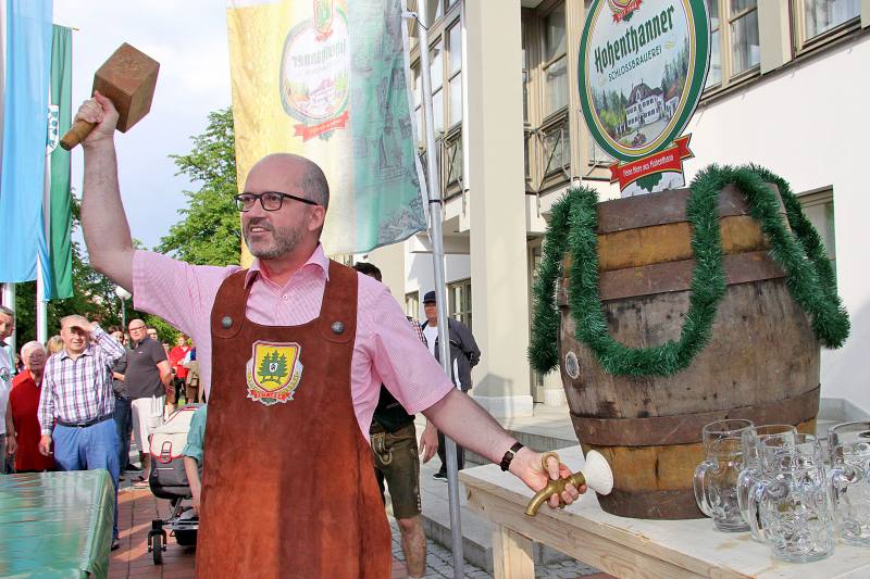 Von Andreas Strauß | 14. Mai 2015 | Kategorie: Allgemein | Kommentare deaktiviert für Wunderschöner VolksfestauftaktGestern um 17.30 Uhr startete unser Volksfest mit dem Bieranstich vorm Ergoldinger Rathaus. 2 Schläge waren von mir nötig um das 100 Liter Bierfass anzuzapfen. So viel Teilnehmer am Festumzug weiß ich noch nie, denn die 100 Liter waren gleich getrunken. Dann gings auf die ca. 2 km lange Wegstrecke zum Volksfestplatz. Die neue Anordnung von Schaustellgeschäften und Festzelt ist optimal. Der Festzug marschiert durch die Mitte des Festplatzes direkt auf den Haupteingang zu. Es war ein wunderbares Bild die Teilnehmer des Umzugs in das Zelt einziehen zu sehen. Drinnen erwartete uns dann stimmungsvolle Musik, hervorragendes Essen unserer Festwirtsfamilie Krämmer, der neue Festmärzen von der Schloßbrauerei Hohenthann und hervorragende Stimmung. Das Festzelt war gut gefüllt bis in den späten Abend. Dann ging es nach draußen in die Urweiße-Hütten vom Erdinger Weißbräu. Dort gibts dann das Erdinger Weißbier, das Hohenthanner Schnackelbier und noch viele andere Sachen zum trinken.