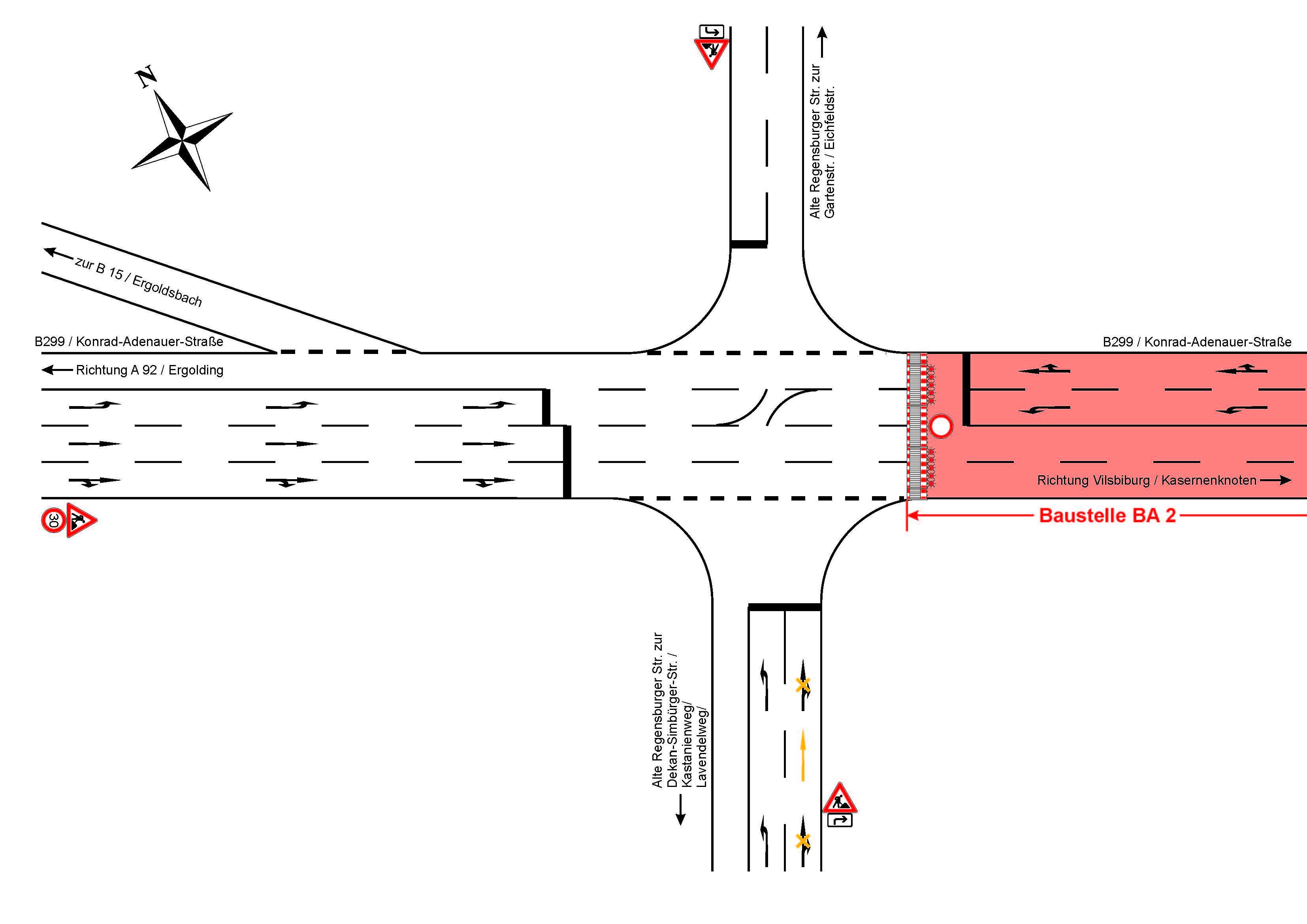 Im Bereich der Kreuzung mit der Alten Regensburger Straße kann aufgrund der Sperrung des zweiten Bauabschnittes von beiden Richtungen der Alten Regensburger Straße nicht in die Konrad-Adenauer-Straße in Richtung Süden eingebogen werden. Das Queren der Konrad-Adenauer-Straße im Zuge der Alten Regensburger Straße ist in beide Fahrtrichtungen möglich. Aus Richtung Norden kommend ist das Einbiegen in die westlich und östlich von der Konrad-Adenauer-Straße liegenden Abschnitte der Alten Regensburger Straße ebenfalls möglich. Im beigefügten Schemaplan sind der Kreuzungsbereich mit der Alten Regensburger Straße und die Fahrmöglichkeiten in diesem Bereich dargestellt.