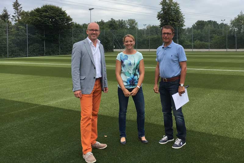 Durch die starke Abnutzung seit Inbetriebnahme des Kunstrasenfeldes, wurde ein Austausch des Kunstrasens beim Kleinspielfeld auf dem Gelände des FC Ergolding notwendig. Zuerst wurde der alte Kunstrasen entfernt. Um die Stabilität der Elastikschicht, die unter dem Kunstrasen liegt zu gewährleisten, wurde ein Binder auf der gesamten Elastikschicht aufgetragen. Somit kann eine ähnliche Qualität des Platzes, wie beim großen neuen Kunstrasenfeld erreicht werden. Anschließend konnte der neue Kunstrasen verlegt werden. Mit der Planung und Überwachung der Maßnahme ist das Landschaftsarchitekturbüro Büttner-Klaus beauftragt. Für die Arbeiten wurde die Firma Polytan aus Burgheim beauftragt. Die Gesamtkosten in Höhe von 120.000,00 € sind im Haushalt 2016 des Marktes Ergolding eingeplant. 1. Bürgermeister Andreas Strauß, Dipl.Ing. Yvonne Haller und FC Ergolding Vorstand Josef Loibl waren bei der Besichtigung des Platzes sichtlich zu frieden. Parallel wird auch noch die 400 m Tartanbahn im Sportzentrum gereinigt.