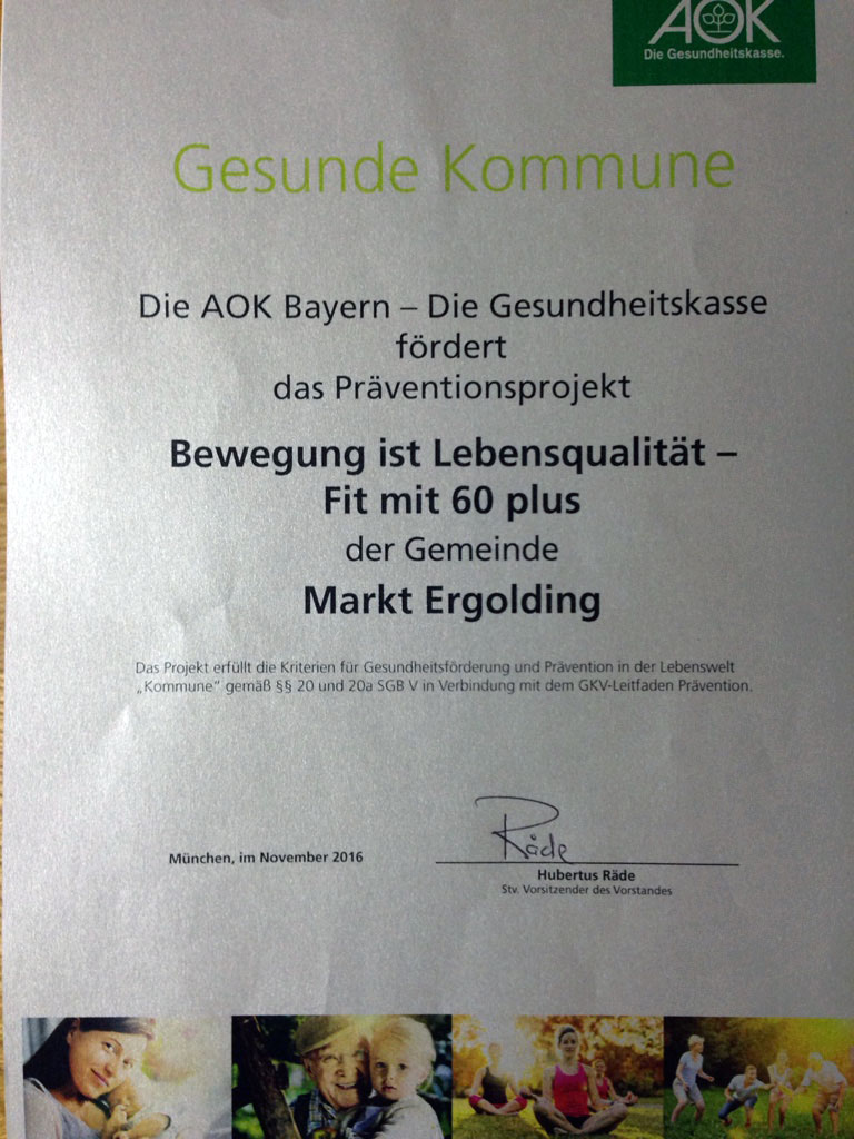 Im Rahmen der ersten Übungseinheit im Ergoldinger Freizeitgebiet übergab die AOK die Urkunde Gesunde Kommune an Bürgermeister Andreas Strauß. Das Präventionsprojekt „Bewegung ist Lebensqualität – Fit mit 60 Plus der Gemeinde Markt Ergolding“ startete am gestrigen Donnerstag. Unter der Anleitung von Physiotherapeut Maximilian Lechner können nun Übungen direkt am Mehrgenerationen-Trainingsgerät im Freizeitgebiet gemacht werden. An dem Gerät werden auf zahlreichen Stationen die Beweglichkeit, Geschicklichkeit, das Gleichgewicht und die Kraft trainiert. Dabei muss man jedoch kein Sportler sein, sondern hier kann jeder mitmachen. Frau Gaudlitz vom Markt Ergolding hat dieses Projekt gemeinsam mit der AOK und Maximilian Lechner ausgearbeitet. Näheres ist dann jeweils dem Marktboten zu entnehmen.