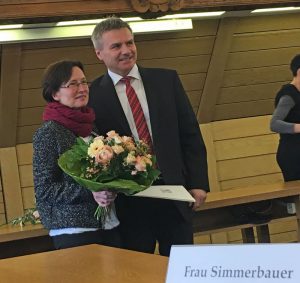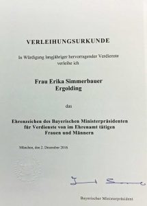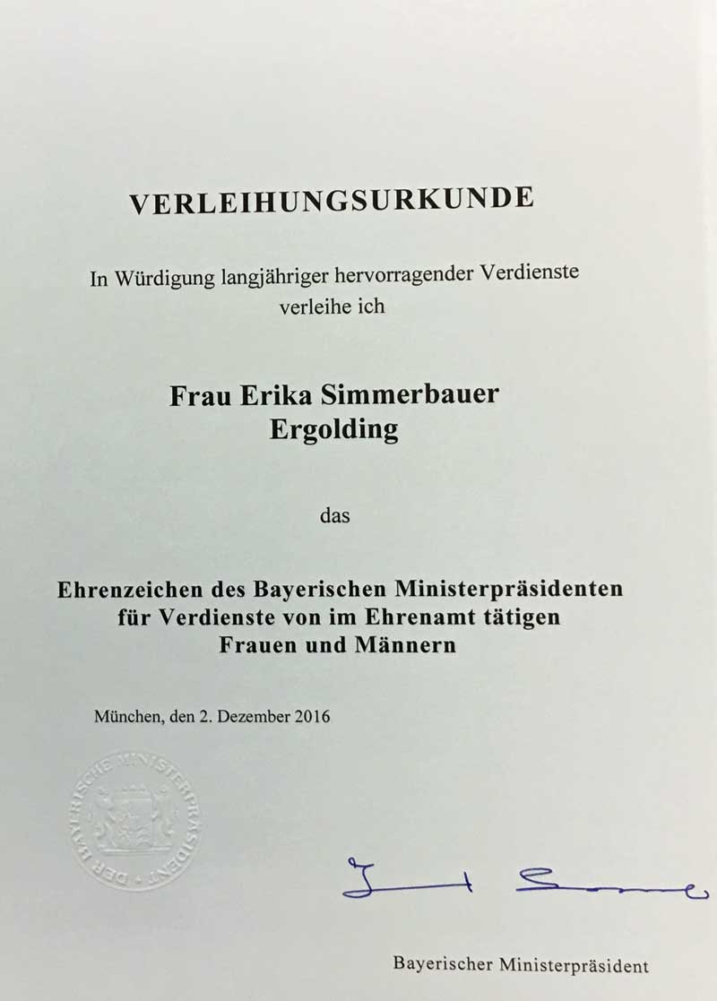 Heute erhielt die Ergoldingerin Erika Simmerbauer im Beisein ihrer beiden Kinder das Ehrenzeichen des Bayerischen Ministerpräsidenten für Verdienste von ihm Ehrenamt tätigen Frauen und Männern.
