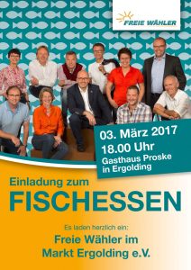 Am 03. März ab 18 Uhr findet das traditionelles Fischessen der Freien Wähler Ergolding e.V. im Gasthaus Proske statt. Es gibt wieder guten Fisch, aber natürlich auch andere Speisen von unserer Gastwirtsfamilie.
