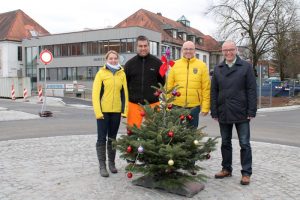 Den Kreisel-Christbaum hat Yvonne Haller vom Ergoldinger Bauamt vergangene Woche von Theo Steininger (Zweiter von links) von der Baufirma Streicher zum erfolgreichen Abschluss des Projekts geschenkt bekommen. Nun lösten Bürgermeister Andreas Strauß (Zweiter von rechts) und sein Stellvertreter Bernhard Pritscher (rechts) das Bäumchen, das zwischenzeitlich von Haller und den Ergoldinger Kreiselfreunden geschmückt worden war, für 100 Euro aus und spenden den Betrag an die Kinderpalliativstation des Kinderkrankenhauses St. Marien in Landshut.