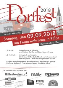 Am Sonntag, den 09. September 2018 feiern die Bürger mit ihrer Freiwilligen Feuerwehr Piflas zusammen das traditionelle Dorffest. Die Bevölkerung ist herzlich willkommen.