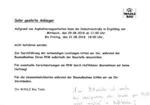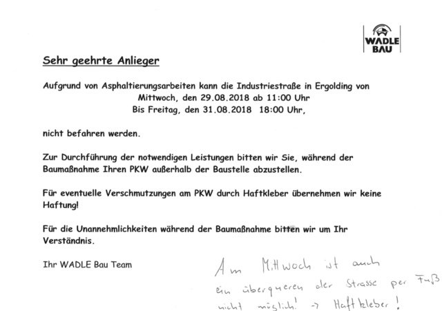 Von Andreas Strauß | 29. August 2018 | Kategorie: Allgemein | Kommentare deaktiviert für IndustriestraßeDie Industriestraße ist ab heute Nachmittag nicht mehr befahrbar.