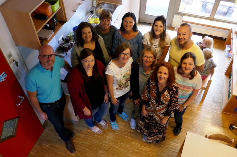 vordere Reihe v. links: Erster Bürgermeister Andreas Strauß, Kathrin Stadler, Sabine Schrader, Susanne Schenkl, Tina Zaleschik (Einrichtungsleitung), Renate Raczka Hintere Reihe v. links: Judith Richling, Sabine Högl, Renate Wittmann, Sabrina Heider van der Mey, Michael Weigmann