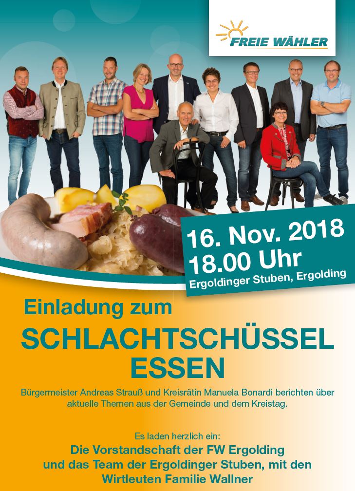 Von Andreas Strauß | 30. Oktober 2018 | Kategorie: Allgemein | Kommentare deaktiviert für SchlachtschüsselessenAuch in diesem Jahr laden die Freien Wähler Ergolding wieder zum leckeren Schlachtschüsselessen ein.