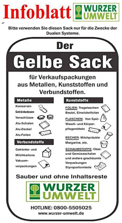Die nicht zweckbestimmte Verwendung der gelben Säcke (z.B. für Hausmüll, für Tomatenzucht etc.), sowie die umfangreiche Lagerhaltung von gelben Säcken in privaten Haushalten führen zu einem großen Widerspruch zwischen der rechnerischen Zahl an gelben Säcken zu der tatsächlichen Zahl an verbrauchten gelben Säcken. Wir möchten daran erinnern: Der gelbe Sack ist ein Wirtschaftsgut! Für die Bürgerinnen und Bürger der Städte und Landkreise ist der gelbe Sack zwar kostenlos und in angemessenem Umfang vorhanden, jedoch nicht unbegrenzt! Wir appellieren an Sie, die gelben Säcke nur für die Sammlung von gebrauchten Leichtverpackungen zu verwenden und auch nur so viele Rollen zu Hause zu bevorraten, wie tatsächlich erforderlich sind. Sie helfen dabei nicht nur der Umwelt sondern sorgen damit auch dafür, dass wir den Städten und Landkreisen eine faire Anzahl von Säcken zur Verfügung stellen können. Für Ihre Mithilfe bedankt sich das Team von Wurzer Umwelt.