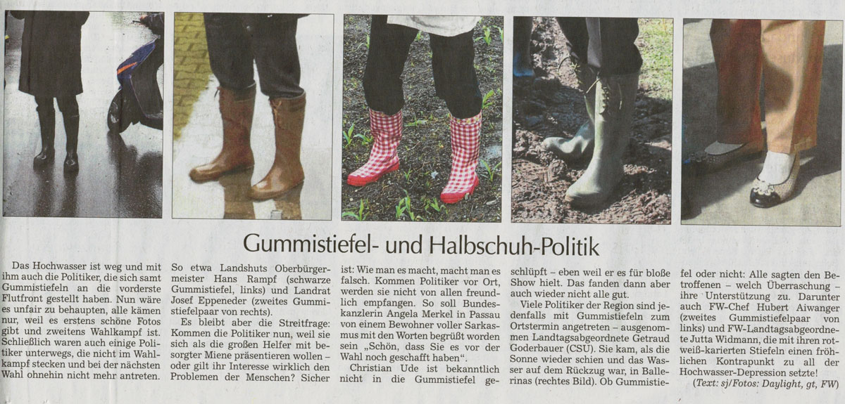 Am Dienstag erschien in der Landshuter Zeitung ein netter Fotobericht. Dort wurden lediglich die Schuhe von Prominenten bei ihren Besuchen der Katastrophengebiete gezeigt. Einfach auf den Artikel klicken, dann ist es besser zu lesen.