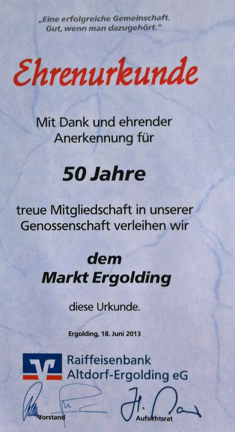 Das wird jetzt den einen oder anderen wundern, zumal ich ja gerade 44. Jahre alt bin. Wie geht das? Das haben sich dann auch einige Mitglieder der Raiffeisenbank Altdorf-Ergolding gefragt. Aber das konnte ich schnell aufklären. Ich war als Vertreter des Marktes Ergolding eingeladen. Und der Markt Ergolding ist zwischenzeitlich seit 50 Jahren bei der Raiffeisenbank Mitglied.
