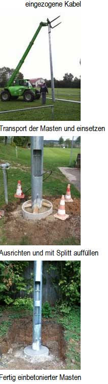 Von Andreas Strauß | 11. Januar 2014 | Kategorie: Allgemein | Kommentare deaktiviert für Flutlichtanlage SV OberglaimBeim SV Oberglaim stand dieses Jahr auch eine große Investition an. Die Flutlichtanlage mit ihren hölzernen Stämmen beim Fußballplatz war in die Jahre gekommen und sollte durch eine neue Anlage ausgetauscht werden. Diese Maßnahme bedeutet eine erhebliche finanzielle Belastung für den Gesamtverein, die gemeinsam mit einer Beteiligung des Marktes Ergolding geschultert wird. Dazu kommt jedoch in erheblichem Maße, dass viele Arbeitsstunden durch die Mitglieder in Eigenleistung erbracht wurden.