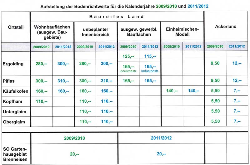Nachfolgend die Aufstellung der Bodenrichtwerte für den Markt Ergolding: