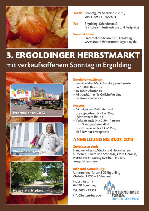 Der Ergoldinger Herbstmarkt findet am Sonntag, den 29.09.2013 von 11.00 – 18.00 Uhr statt. Veranstaltungsort ist das Schinderstraßl (zwischen Industriestr. und Festplatz).