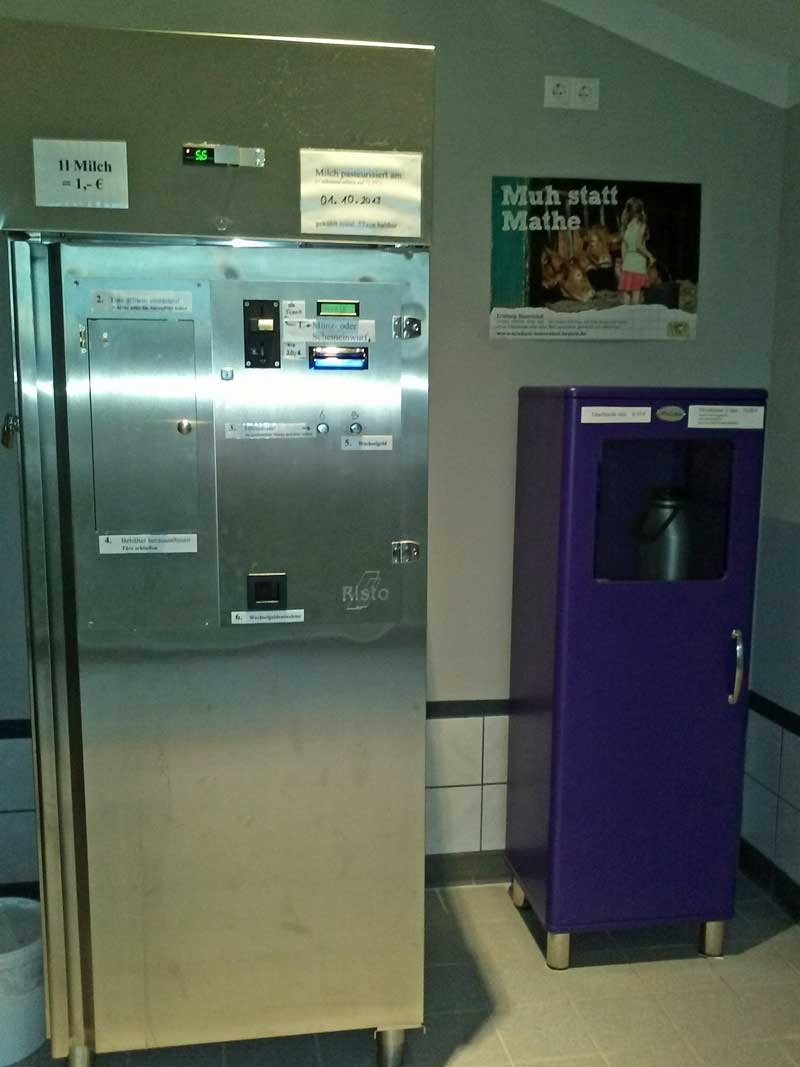 Täglich von 6 Uhr bis 22 Uhr erhalten Sie frische pasteurisierte Milch aus dem Automaten, zum selber zapfen. Es ist ganz einfach sich jede beliebige Menge der genfreien Milch in ein mitgebrachtes Gefäß zu füllen. Sollten Sie spontan „vorbeikommen“ dann stehen Ihnen neue Glasflaschen für 1 Liter Milch sowie Milchkannen für 2 Liter Milch zum Einkaufspreis von 0,35 Euro bzw. 10 Euro zur Verfügung. Die pasteurisierte Milch hält sich mindestens 5 Tage im Kühlschrank. Das Datum der letzten Pasteurisierung ist am Automaten vermerkt.