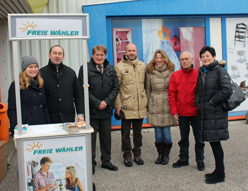 Bettina Schwarz, MdL Hubert Aiwanger, 1. Bürgermeister Josef Heckner, 3. Bürgermeister Andreas Strauß, Marktgemeinderäte Dr. Dagmar Hofmann und Franz Stöckl, Gemeinderatskandidatin Andrea Wendt